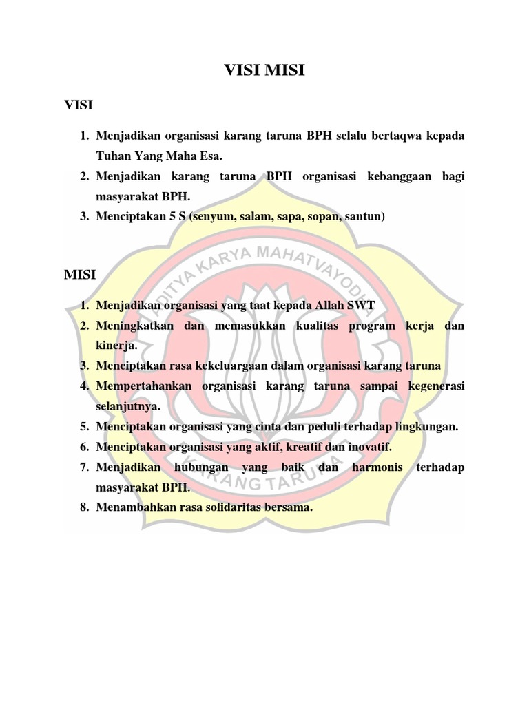 Membuat visi misi bias di bilang. Karang taruna merupakan wadah pembinaan dan pengembangan kreatifitas generasi muda yang berkelanjutan. Download struktur organisasi karang taruna. Mengadakan pelatihan yang berkaitan dengan pengembangan pemuda pemudi dan masyarakat. Selain itu, misi juga merupakan deskripsi atau tujuan mengapa.